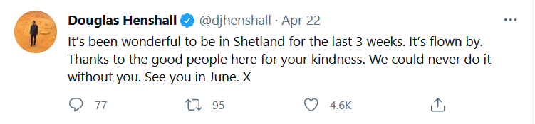 Douglas Henshall that portraits DI Jimmy Perez, also tweeted: